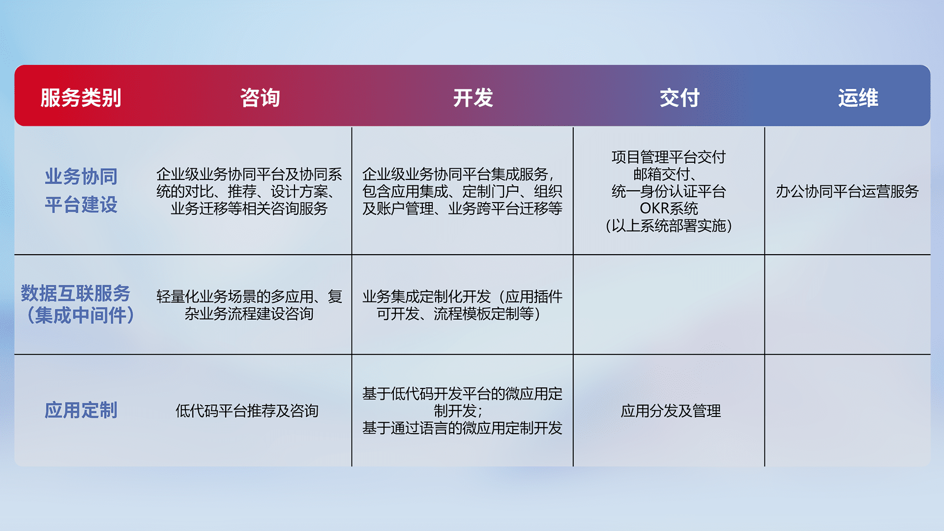 针对钉钉、、、企微、、、、IDaas等平台级产品提供产品的规划、、方案、、、交付、、、定制化开发等服务,,实现如统一协同办公、、、智能客户服务、、、混合会议管理、、智能数据查询、、、等业务场景,,,实现数字化转型。。